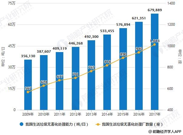 ? ? 垃圾產量與清運量的不斷增加,給生活垃圾處理帶來了新的挑戰。據前瞻產業研究院發布的《中國生活垃圾處理行業發展前景與投資預測分析報告》統計數據顯示,2009-2017年,我國生活垃圾處理能力以及處理量不斷提升。2009年,我國生活垃圾無害化處理能力為35.61萬噸/日,擁有生活垃圾無害化處理廠567座。截止至到2017年,我國生活垃圾無害化處理能力達到67.99萬噸/日,擁有生活垃圾無害化處理廠1013座。