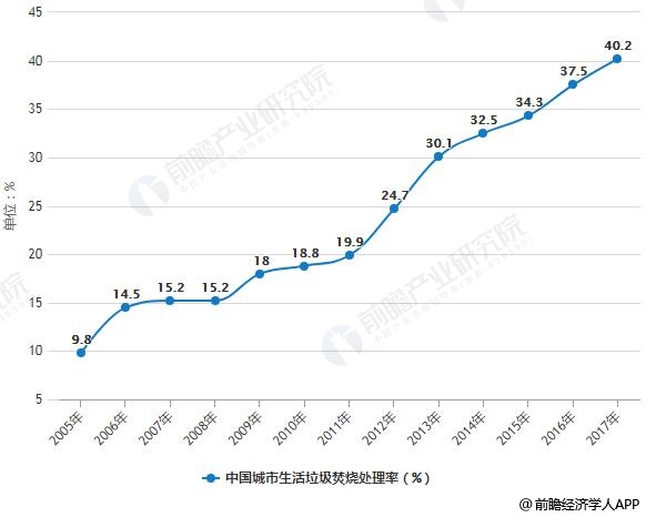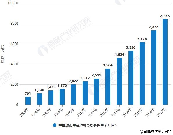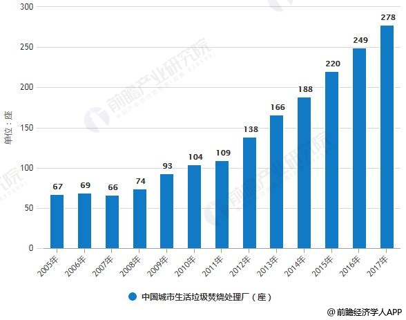 ? ? 和傳統的堆肥、填埋等處理方式相比,焚燒具有處理效率高、占地面積小、對環境影響相對較小等優點,更能滿足城市生活垃圾處理對減量化和無害化的要求。并且焚燒處理的方式還能利用焚燒產生的熱能,實現垃圾的資源化,這些優勢使得垃圾焚燒處理在近些年逐漸得到了較為廣泛的應用與推廣。焚燒垃圾場的數量從2005年的67座增長到2017年的286座,焚燒垃圾處理量由2005年的791萬噸增長到2017年的8463.3萬噸。焚燒處理率由2005年的9.8%上升到2017年的40.2%。