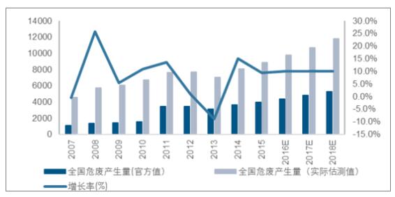 ? ? 2015年全國危廢產(chǎn)生量為3976萬噸,但是由于該數(shù)據(jù)來源于企業(yè)自主申報,明顯低于實際產(chǎn)生量。2007年危廢的產(chǎn)生量為4574萬噸,大幅高于當(dāng)年《統(tǒng)計年報》所統(tǒng)計的數(shù)字1079萬噸。污染源普查公告的數(shù)字接近真實值,其與企業(yè)自主申報值得比值為4.24。由于2011年危廢申報下限由10kg下降至1kg,危廢當(dāng)年的自主申報產(chǎn)生量大幅上升至3431萬噸,假設(shè)當(dāng)年實際危廢增長率與前三年復(fù)合增長率相同,則當(dāng)年實際估測危廢產(chǎn)量為7651萬噸,實際估測值與申報值之間比值下降為2.23,進一步假設(shè)此后該比例都相同,則預(yù)測2018年全國危廢的實際產(chǎn)量在1.18億噸。而行業(yè)內(nèi)一般認為實際危廢產(chǎn)量在一億噸左右。