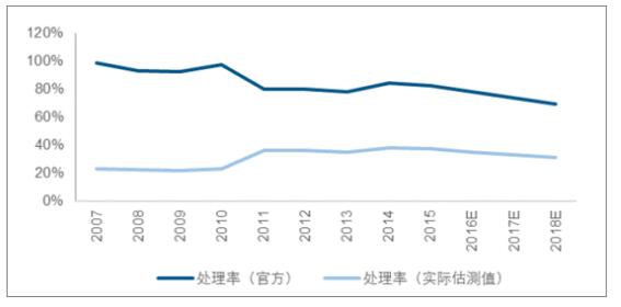 ? ? 從處理量的角度看,2015年危廢處理量為1207萬噸,綜合利用量為2079萬噸,這部分危廢通過正規(guī)渠道進行了處理,并且數(shù)據(jù)相對真實。據(jù)此測算,當(dāng)年危廢處理率為37.08%,也就是說全國還有5578萬噸的危廢通過不正規(guī)渠道進行處理。
